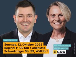| Newsletter der CDU Walldorf vom 05.10.2025 Liebe Newsletterabonnenten, zunächst zwei überörtlich interessante Artikel von unserer Homepage, die Sie aber auch bei Christiane Staab finden können: |  Unmissverständliches Signal nach Berlin | |  Oppelt-Staab: Ausbau der A5 am Walldorfer-Kreuz darf nicht dem Rotstift zum Opfer fallen | Bitte beachten Sie die aktuellen Termine der Woche (Vorstandssitzung am 8.10. um 20:00 Uhr und den Politischer Frühschoppen mit CDU Generalsekretär Tobias Vogt MdL und Christiane Staab MdL am 12.10.) sowie hier noch die aktuellen News und Pressemitteilungen der CDU Walldorf: Walldorf-Pass Mobilität ist mehr als nur ein Mittel zur Fortbewegung – sie ist ein zentraler Schlüssel zu gesellschaftlicher Teilhabe. Wer mobil ist, hat Zugang zu Bildung, Arbeitsplätzen, Gesundheitsversorgung und sozialen Kontakten. Für Senioren und Seniorinnen sowie Familien mit niedrigem Einkommen ist das Deutschlandticket bzw Jugendticket BW, trotz seiner vergleichsweise günstigen Konditionen oft eine finanzielle Belastung. Eine 20?%-Bezuschussung würde das Ticket für diesen Personenkreis um 8€ bzw ca 10?€ pro Monat vergünstigen – das entspricht einer spürbaren Entlastung im Haushaltsbudget. Politischer Frühschoppen zu einem politischen Frühschoppen lädt die Landtagsabgeordnete Christiane Staab gemeinsam mit dem CDU-Stadtverband Walldorf am Sonntag, 12. Oktober 2025, um 11:00 Uhr in die Grillhütte (Schwetzinger Straße 99, Walldorf) ein. Ehrungsabend der CDU Walldorf Die CDU Walldorf hatte am Samstag zum Ehrungsabend in das Restaurant Pagoni eingeladen. In geselliger Atmosphäre wurde auf die Verdienste langjähriger Mitglieder geblickt und natürlich auch auf aktuelle politische Themen. Trauer um Hannelore Blattmann In tiefer Dankbarkeit und Wertschätzung nehmen wir Abschied von Altstadträtin Hannelore Blattmann - Trägerin des Bundesverdienstkreuzes am Bande - Der Stadtverband und die Gemeinderatsfraktion der CDU-Walldorf verlieren mit Hannelore Blattmann eine langjährige und hoch geachtete Kollegin, die in zahlreichen Ämtern und Funktionen unsere Stadt mitgeprägt hat. Walldorf-Pass fördert künftig auch Mobilität junger Menschen Die Stadt Walldorf wird ab 1. Januar 2026 das Jugendticket BW beziehungsweise das Deutschland-Ticket für Walldorfer Jugendliche mit 20 Prozent der Kosten bezuschussen. Diese Förderung, die auf einem Antrag der Fraktion Bündnis 90/Die Grünen beruht, wird über den Walldorf-Pass erfolgen. Der Erste Beigeordnete Otto Steinmann stellte in der jüngsten Sitzung des Gemeinderats auch einige weitere Änderungen vor, die ebenfalls beschlossen wurden: so, dass der Walldorf-Pass auch für Familien mit mehr als zwei Kindern ab dem kommenden Jahr einkommensabhängig sein wird und dass bei der Berechtigung für Seniorinnen und Senioren künftig das vollendete 65. Lebensjahr (und nicht mehr das 60.) zugrunde gelegt wird, wobei es einen „Bestandsschutz“ für alle gibt, die den Pass bereits haben oder in den nächsten fünf Jahren hätten beantragen können. Schwerbehinderte über 55 Jahre mit einer Erwerbsminderung von mindestens 80 Prozent können den Walldorf-Pass auch weiterhin beantragen. Weiterlesen auf www.walldorf.de Die Grundsatzdebatte zur Klimatisierung kommt Der Ausschuss für Technik, Umwelt, Planung und Verkehr wird sich in einer seiner kommenden Sitzungen ganz grundsätzlich mit der Frage beschäftigen, ob und wie eine Klimatisierung städtischer Gebäude notwendig und möglich ist. Eine solche Grundsatzdebatte hatte die FDP-Fraktion beantragt, der Gemeinderat konnte dem am Dienstagabend einhellig zustimmen. Der besondere Fokus soll auf Einrichtungen gelegt werden, in denen sogenannte vulnerable Gruppen, also vor allem Kinder und ältere Menschen, betreut werden. Es wird sowohl um die Nachrüstung bestehender Gebäude gehen als auch um die Planung für künftige Neubauten. Und es soll geprüft werden, wie die Umsetzung möglichst klimafreundlich – also durch „grünen“ Strom, etwa aus Photovoltaikanlagen – erfolgen kann. Weiterlesen auf www.walldorf.de Auf dem Weg zur strategischen Umweltplanung „Dieses Planwerk ist eine wichtige Grundlage für die naturräumliche Entwicklung Walldorfs“, sagte Stadtbaumeister Andreas Tisch. In der jüngsten Sitzung des Ausschusses für Technik, Umwelt, Planung und Verkehr stand der Abschluss der Orientierungsphase zur Erstellung des Landschaftsplans der Stadt auf der Tagesordnung. Mit dem Plan stelle man „eine aktuelle Übersicht über Natur und Landschaft“ bereit, erklärte Dr. Werner Dieter Spang (Büro Spang.Fischer.Natzschka, Wiesloch) in seinem Bericht. „Das braucht Zeit“, meinte der Stadtbaumeister. Der bestehende Landschaftsplan wurde in den Jahren 1981 bis 1987 erarbeitet, für seine Aktualisierung fiel der öffentliche Startschuss mit einem Workshop im Oktober 2023, an dem sich rund 30 interessierte Bürgerinnen und Bürger beteiligten. Spang.Fischer.Natzschka wurde jetzt vom Ausschuss in Kooperation mit dem Büro HHP.raumentwicklung, Rottenburg, für eine Angebotssumme von rund 120.000 Euro einstimmig mit den weiteren Arbeitsschritten beauftragt. Weiterlesen auf www.walldorf.de Jetzt wird Bilanz gezogen Die Tage werden wieder kürzer und die temporär angelegte Umgestaltung in der vorderen Hauptstraße neigt sich dem Ende zu. Seit dem 5. Juni konnte in der sogenannten Sommerstraße eine neue Aufteilung des begrenzten Straßenraums erprobt und damit erlebbar gemacht werden. Ein wichtiges Anliegen der Stadt war es, die Sicherheit im besagten Abschnitt zu optimieren, aber auch die Atmosphäre zu verbessern und die Aufenthaltsdauer in der Hauptstraße zu erhöhen. Weiterlesen unter www.walldorf.de Aktuelle Entscheidungen im Gemeinderat Der Gemeinderat hat sich in seiner heutigen Sitzung mit folgenden Themen beschäftigt: Weiterlesen auf www.walldorf.de TERMINE/VERANSTALTUNGEN | 08.10.2025 20:00 Uhr bis zum 08.10.2025 20:30 Uhr | Mitgliederoffene Vorstandssi