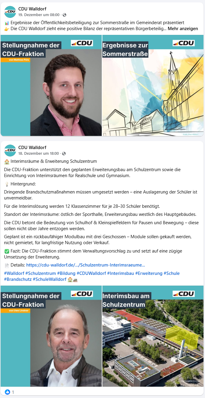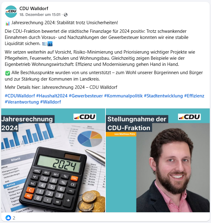 Weihnachts-Newsletter der CDU Walldorf vom 22.12.2025 Liebe Newsletterabonnenten, das Jahr neigt sich dem Ende zu und die Weihnachtszeit gibt Gelegenheit, innezuhalten und zurückzublicken. 2025 war für uns ein intensives Jahr – geprägt vom Bundestagswahlkampf, von lebhaften bundespolitischen Debatten und von großem Engagement auf allen Ebenen.  Weihnachten | Christiane Lang Gerade vor Ort hat sich erneut gezeigt, was unsere CDU Walldorf ausmacht: Ob bei der Straßenkerwe, auf dem Weihnachtsmarkt oder bei vielen Gesprächen am Rande von Veranstaltungen – Ihr Einsatz, Ihre Präsenz und Ihre Bereitschaft zum Mitmachen haben unser gemeinsames Auftreten getragen und sichtbar gemacht. Dafür danke ich Ihnen sehr herzlich. Ihr Engagement ist keine Selbstverständlichkeit, sondern die Grundlage unserer Arbeit und unseres Erfolgs. Mit dem Blick nach vorn steht 2026 bereits vor der Tür – mit der anstehenden Landtagswahl als nächstem wichtigen Meilenstein. Gemeinsam wollen wir diesen Weg gehen, gut vorbereitet, geschlossen und mit klaren Ideen für Baden-Württemberg und für Walldorf. Ich wünsche Ihnen und Ihren Familien ein gesegnetes Weihnachtsfest, ruhige und erholsame Tage sowie Gesundheit, Zuversicht und Kraft für das neue Jahr. Mit herzlichen Grüßen und den besten Wünschen für 2026, Clemens Kriesel Weihnachtswünsche von unserer Landtagsabgeordneten Christiane Staab:  @Christiane Staab Hier noch die Artikel aus der Presse und dem Gemeinderat sowie der nächsten Termine: Weihnachtsgrüße der CDU Walldorf Liebe Walldorferinnen und Walldorfer, wieder geht ein Jahr zu Ende. Ein Jahr, das auch für uns als Ortsverband Höhen und Tiefen hatte. Unsere Stände auf der Straßenkerwe und dem Weihnachtsmarkt zählen zweifelsohne zu den Höhepunkten des Jahres. Ebenso die Stammtische, zu denen wir geladen haben. Aber es gab auch Tiefen. Wir haben geschätzte Freunde und Mitglieder verloren, die über Jahrzehnte nicht nur die CDU, sondern Walldorf allgemein maßgeblich geprägt haben. Im neuen Jahr stehen einige Herausforderungen an, wie die Landtagswahl. Wir begrüßen 2026 mit Mut und Zuversicht. Schulzentrum -Interimsräume -Standort und Raumprogramm Die Tatsache für die heutigen Entscheidungen in Sachen „Interimsräume, Standort und das erforderliche Raumprogramm“ für Realschule und Gymnasium, sind die dringenden erforderlichen Umsetzungen der anstehenden brandschutztechnischenThemen, die in den nächsten Jahren angegangen und umgesetzt werden müssen. Adventsgrüße der CDU Walldorf Die CDU Walldorf wünscht allen Bürgerinnen und Bürgern eine besinnliche Adventszeit. Jahresrechnung 2024 Das Jahr 2024 steht exemplarisch für die fiskalischen Ungewissheiten, von denen auch Walldorf nicht verschont wird. Einerseits erkennen wir, wie prosperierend sich unser Wirtschaftsstandort auch im Bundes- und landesweiten Vergleich nach wie vor entwickelt. Andererseits erleben wir auch, wie unter der Systematik von Voraus- und Nachzahlungen sowie bei der Rückerstattung von Gewerbesteuerzahlungen unser städtischer Haushalt multimillionenschweren Schwankungen unterliegt. Fest steht unser konstant hoher Bedarf an Zahlungseingängen und Liquidität. Die in der Vorlage beschriebene „sich verdichtende Infrastruktur“ bedingt ebendies. Umso positiver bewerten wir daher die Gewerbesteuerentwicklung quasi in letzter Minute des abgelaufenen Jahres. Öffentlichkeitsbeteiligung Sommerstraße Die temporäre Umgestaltung der Hauptstraße kann ohne Weiteres als prägendes Projekt des zu Ende gehenden Jahres beschrieben werden. Die Bevölkerung treiben Veränderungen in der Ortsmitte um. Das ist im Interesse einer Verbesserung auch äußerst wichtig. Dementsprechend ist es wesentlich, der Beteiligung sowohl der Öffentlichkeit als auch der Betroffenen eine hohe Bedeutung zuzumessen. In jedem Fall begründet die Maßnahme die Formate der repräsentativen Umfrage, der offenen Umfrage wie auch die Postkartenaktion und die Einbindung der Gewerbetreibenden. TERMINE/VERANSTALTUNGEN | 28.01.2026 19:30 Uhr bis zum 28.01.2026 21:30 Uhr | Mitgliederoffene Vorstandssitzung Treffpunkt: Online und vor Ort Mitgliederoffene Vorstandssitzung: 28.01.2026, 19:00; (Auch Online) Anmeldungen von Mitgliedern unter c.kriesel@cdu-walldorf.de. Sie erhalten dann zeitnah die Zugangsdaten und Örtlichkeiten | Zum Abschluss, wie immer noch ein kurzer Blick auf die sozialen Medien:   Auch ich wünsche Ihnen allen frohe Weihnachten und einen richtig gemütlichen, fantastischen Rutsch in das neue Jahr. Mit herzlichen Grüßen und den besten Wünschen für 2026, Markus Binder |