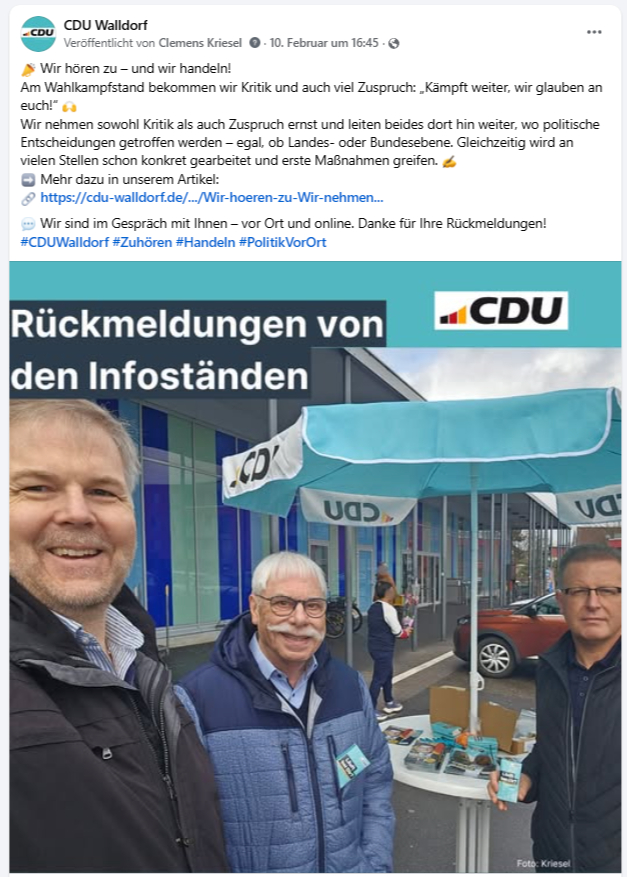 Politik lebt vom Dialog – und genau diesen Dialog erleben wir aktuell sehr intensiv. In den vergangenen Wochen haben wir als CDU Walldorf viele Gespräche geführt, unter anderem an unseren Wahlkampf- und Infoständen. Diese Begegnungen waren offen, ehrlich und vielfältig.