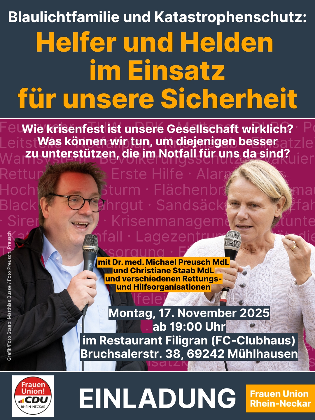 Mühlhausen. Die Frauen Union Rhein-Neckar lädt am Montag, 17. November 2025, um 19:00 Uhr, zu einer öffentlichen Veranstaltung unter dem Titel „Blaulichtfamilie und Katastrophenschutz: Helfer und Helden im Einsatz für unsere Sicherheit“ ein.