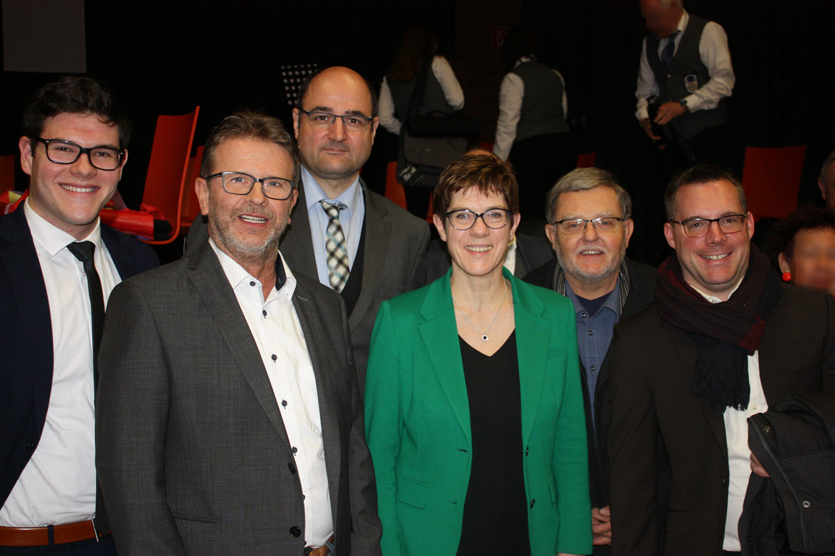Einige Mitglieder der CDU Walldorf sind am 08. Februar 2019 der Bundesvorsitzenden der CDU, Annegret Kramp-Karrenbauer, in der Kraichgauhalle in Mühlhausen anlässlich der Verabschiedung von Professor Dr. Harbarth begegnet: Max Hartl, Rainer Kempf, Kian Fathieh, Thomas Förster, Stefan Hornig, Andreas Staab
