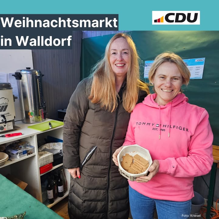 mehr✨ Adventszeit am CDU-Stand!Heute begrüßen Katrin Siebold und Christiane Staab die Besucherinnen und Besucher mit viel guter Laune.Auf dem Bild reicht Christiane eine Schale Spekulatius, die wir passend zu unserem Hot Aperol anbieten.Natürlich gibt es auch wieder Chili con und sin Carne sowie Kinderpunsch.Wir freuen uns auf euch und wünschen einen schönen ersten Advent!#Walldorf #Weihnachtsmarkt #CDUWalldorf #ChristianeStaab #KatrinSiebold #Advent #HotAperol #Spekulatius #ChiliConCarne #ChiliSinCarne #Kinderpunsch #GemeinsamVorOrt