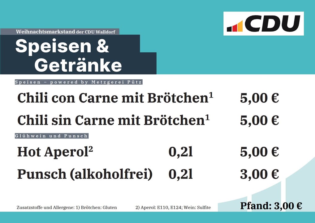 mehr🌆 Die Walldorfer Kerwe läuft ? und die Stimmung an unserer CDU-Hütte ist großartig! 🎡Bei Aperol Spritz, Hugo, Prosecco und unserem beliebten Kerwesnack von der Metzgerei Pütz genießen viele Gäste den Kerweabend in bester Gesellschaft. 🍹🥪Ein herzliches Dankeschön an alle, die heute schon vorbeigeschaut haben ? es macht einfach Spaß, so viele bekannte Gesichter zu sehen! 😊Kommt gerne noch vorbei ? wir sind noch da und freuen uns auf euch!#CDUWalldorf #WalldorferKerwe #Kerwe2025 #CDUHütte #Kerwestimmung #AperolSpritz #Prosecco #Kerwesnack #MetzgereiPütz #FairerPreis #GemeinschaftErleben