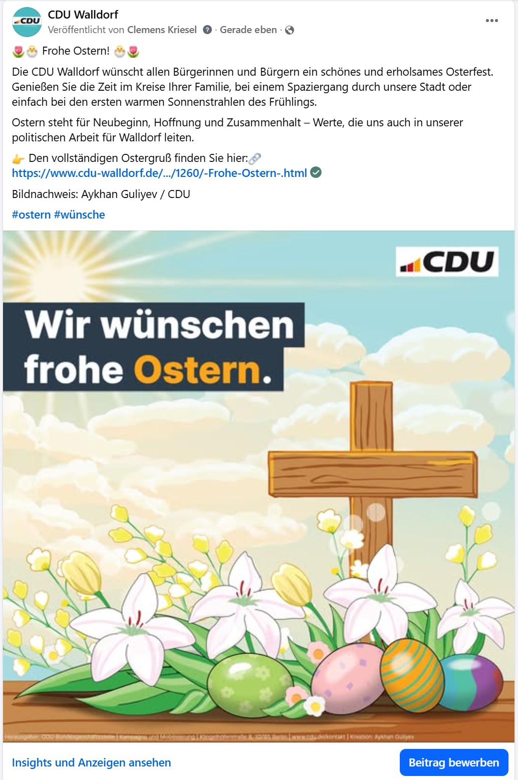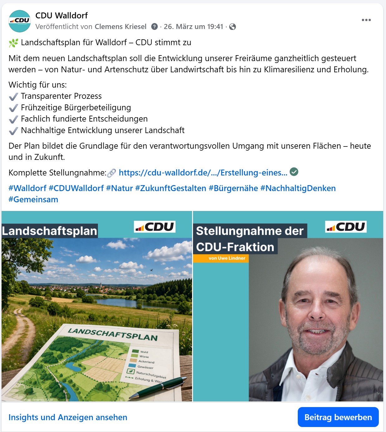 Osternewsletter der CDU Walldorf vom 05.04.2026 Frohe Ostern liebe Newsletterabonnenten, Ostern ist eine Zeit der Hoffnung, des Neubeginns und des Miteinanders. Auch wir möchten diese Gelegenheit nutzen, um Ihnen nicht nur herzliche Ostergrüße zu übermitteln, sondern Sie zugleich über wichtige Themen aus Walldorf zu informieren. Christiane Staab informiert auf ihrer Seite über das Sanierungsprogramm 2026 für den Straßenerhalt. Und hier die Artikel und Presseberichte: Gedenken an Karl-Heinz Kögel Mit großer Trauer nehmen wir Abschied von unserem langjährigen Mitglied Karl-Heinz Kögel. Geboren am 12. Juni 1937, trat er im Jahr 1969 in die CDU ein und hat unsere Partei über Jahrzehnte hinweg mit seiner Treue und seinem Engagement begleitet. Sein Wirken bleibt unvergessen. Frohe Ostern Liebe Mitbürgerinnen und Mitbürger, Ostern ist das Fest der Hoffnung, der Erneuerung und des Aufbruchs. Auf den Sport und das Ehrenamt Am Freitag vor einer Woche fand in der Astoria-Halle der Ehrungsabend der Stadt Walldorf statt. Auch die CDU Walldorf war mit einigen Mitgliedern im Saal vertreten. Zunächst wurden nach der Begrüßung durch Bürgermeister Matthias Renschler fünf besondere Menschen für ihr ehrenamtliches Engagement ausgezeichnet. Schöne Osterferien Nicht mehr lange, dann hoppelt der Osterhase wieder durch die Gärten. Die CDU Walldorf wünscht allen Schülern erholsame und fröhliche Osterferien. Nach den intensiven Wochen in der Schule ist die unterrichtsfreie Zeit eine willkommene Gelegenheit, um Kraft zu tanken, Zeit mit Familie und Freunden zu verbringen und den Frühling zu genießen. Erstellung eines Landschaftsplans Obwohl nach den Verfahrensvorschriften des Naturschutzgesetzes ein Aufstellungsbeschluss nicht zwingend erforderlich ist, sollten auch wir als eigenständige Kommune mit Wäldern, Wiesen und Ackerland u.a. konkrete Trassen bzw. Schutzgebiete mit einem Aufstellungsbeschluss für den kommunalen Landschaftsplan sowie zur Besetzung des Begleitgremiums angehen und entsprechend anpassen. Förderprogramme der Stadt Walldorf Die vielfältigen Förderprogramme werden weiterhin sehr gut angenommen und stoßen sowohl bei privaten Haushalten als auch bei Gewerbetreibenden auf großes Interesse. Die hohe Inanspruchnahme unterstreicht die Wirksamkeit der Programme sowie deren passgenaue Ausrichtung auf aktuelle gesellschaftliche und ökologische Herausforderungen. „Auf dem Weg in die richtige Richtung“ Die Stadt Walldorf hat im Jahr 2025 über ihre Umweltförderprogramme rund 2,2 Millionen Euro an Zuschüssen ausbezahlt. Darüber informierte Alena Müller, die Leiterin des Fachbereichs Umwelt und Ordnung, den Gemeinderat in dessen jüngster Sitzung. „Der absolute Großteil geht in die Solarenergie“, sagt sie mit Blick auf mehr als 1,9 Millionen, die in die beiden Photovoltaik-Förderprogramme flossen. Inzwischen sind laut der Verwaltungsvorlage rund die Hälfte aller Walldorfer Wohngebäude mit PV-Anlagen ausgestattet. Sie decken etwa 80 Prozent des Stromverbrauchs der privaten Haushalte ab. „Wir sind definitiv auf dem Weg in die richtige Richtung“, sagte Alena Müller. Weiterlesen hier Neue Büroflächen für die Stadtverwaltung Der Gemeinderat hat sich in seiner jüngsten Sitzung mit der geplanten Bebauung der Grundstücke Johann-Jakob-Astor-Straße 3 und 5 beschäftigt. Dort sollen zusätzliche Büroflächen für die Stadtverwaltung entstehen. Das Gremium beauftragte die Verwaltung bei einer Gegenstimme (Christian Schick, SPD) mit den weiteren Schritten. Um die Vergabe der Planungsleistungen möglichst schnell durchführen zu können, beschloss der Rat zudem mehrheitlich, ein vom Stadtbauamt vorgeschlagenes alternatives Vergabeverfahren zu wählen. Diese Entscheidung fiel bei 13 Ja-Stimmen, viermal Nein (Dr. Andrea Schröder-Ritzrau, Christian Schick, Petra Wahl, Manfred Zuber, alle SPD) und drei Enthaltungen (Dr. Gerhard Baldes, CDU, Mihriban Gönenç, Zusammen für Walldorf, und Lorenz Kachler, SPD).Weiterlesen hier Zwei neue Fahrzeuge für die Feuerwehr Die Freiwillige Feuerwehr Walldorf darf sich auf zwei neue Fahrzeuge freuen: Der Gemeinderat hat in seiner jüngsten Sitzung einstimmig die Beschaffung von zwei neuen Löschgruppenfahrzeugen (LF 20) für zusammen rund 1,3 Millionen Euro beschlossen. Sie ersetzen zwei ältere Fahrzeuge mit Baujahr 2005 beziehungsweise 2008. Diese haben allerdings noch nicht sofort ausgedient: Die Lieferzeit für die neuen Autos beträgt zwei Jahre. Weiterlesen hier Mehr Platz für Fußgänger „Das ist wirklich schön geworden – sehr gelungen“, zieht Bürgermeister Matthias Renschler ein positives Fazit, als er sich zusammen mit Vertretern der Stadtverwaltung, des Gemeinderats, der Stadtwerke und des Walldorfer Ingenieurbüros König vor Ort von der sanierten Rheinstraße ein Bild macht. Anfang März wurde die Sanierung der Rheinstraße auf dem 190 Meter langen Teilstück zwischen Kurpfalzstraße und Schwetzinger Straße abgeschlossen. Baubeginn war im April 2025. Weiterlesen hier „Solch ein Projekt entsteht nicht nur auf dem Papier“ Seit über zwei Monaten gibt es auf dem SAP-Parkplatz (zwischen Altrottstraße 44 und 46) einen Ladepark mit zwölf DC-Schnellladepunkten mit einer Leistung von bis zu 400 Kilowatt, die sowohl von SAP-Mitarbeitern als auch externen Nutzern rund um die Uhr genutzt werden können. Möglich macht das eine Kooperation zwischen SAP und Shell. Shell hat die Anlage geplant und gebaut und übernimmt den langfristigen Betrieb. SAP stellt das Grundstück im Rahmen eines 15-jährigen und verlängerbaren Modells bereit. Martin Lustenberger, General Manager Fleet Solutions Europe bei Shell, betonte bei der offiziellen Einweihung des Ladeparks die gemeinsame Entwicklung des Projekts. Man habe eine lange Historie der Zusammenarbeit, so Lustenberger. 2021 habe man mit der Planung des Projekts begonnen, „als deutlich wurde, dass die bestehenden Lademöglichkeiten auf dem Campus zunehmend ausgelaste
